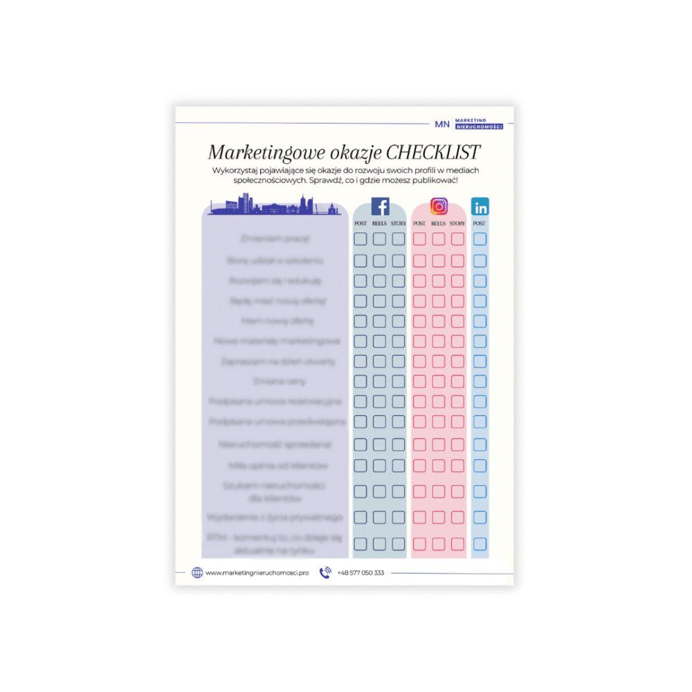 Wykorzystaj naszą chcecklistę „Pośrednik social mediach”, by wyróżnić się tłumu. Będziesz mógł, dzięki niej tworzyć treści, jakich nie tworzy większość pośredników!